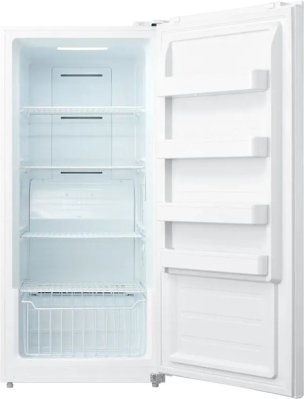The logo-less exterior and white finish on Element’s 13.8 cu. ft. upright freezer allow it to match any space seamlessly. It features an interior light for grabbing a late-night snack. Element’s upright freezer uses a no-frost system, so your food never frosts over. This reduces the chance for odors and freezer burn that can affect the taste of your food. It comes Department of Energy certified to keep your electricity bills down. Bring it home.